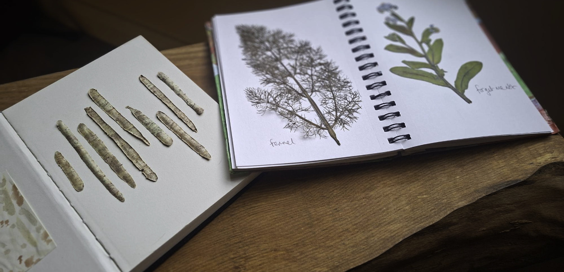 In a typical Nature journaling workshop, I will offer prompts for self-reflection and connection to the natural space we are in, which will be recorded within them. There will often be a small element of observation and ID of flora or fauna but mostly reflecting on what we notice when we slow down. The journals will become truly unique to you, and filled with sketches, doodles, brainstorms, poetry, pressed flowers, leaf rubbings, photos, prose….however you choose to make your mark!